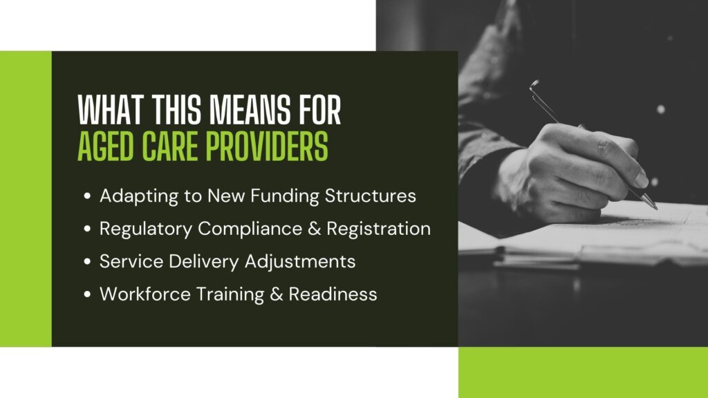 For aged care providers, these changes bring both challenges and opportunities. The shift to a more integrated system means adapting to new funding structures, compliance requirements, and service delivery models. Providers will need to rethink their approach to aged care, ensuring they meet new regulatory standards while continuing to deliver high-quality, personalised support.